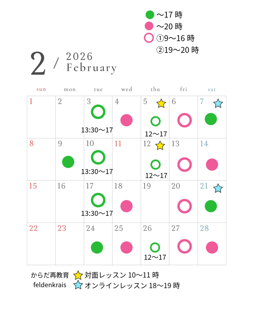 2月の火曜日午前中は、フェルデンクライスの研修がありますので、一部火曜日は午後のみの営業となります。
