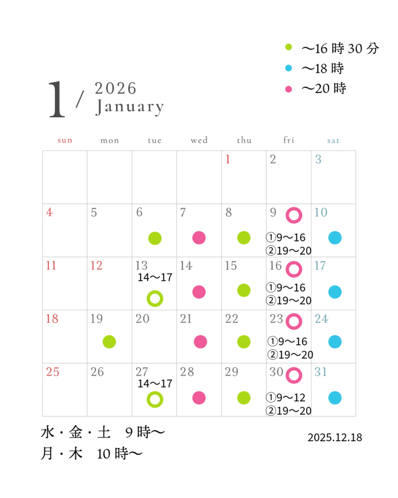 引き続き、水曜日と土曜日の終わり時間は調整出来ますので、お時間が限られる方はご相談くださいね☺️